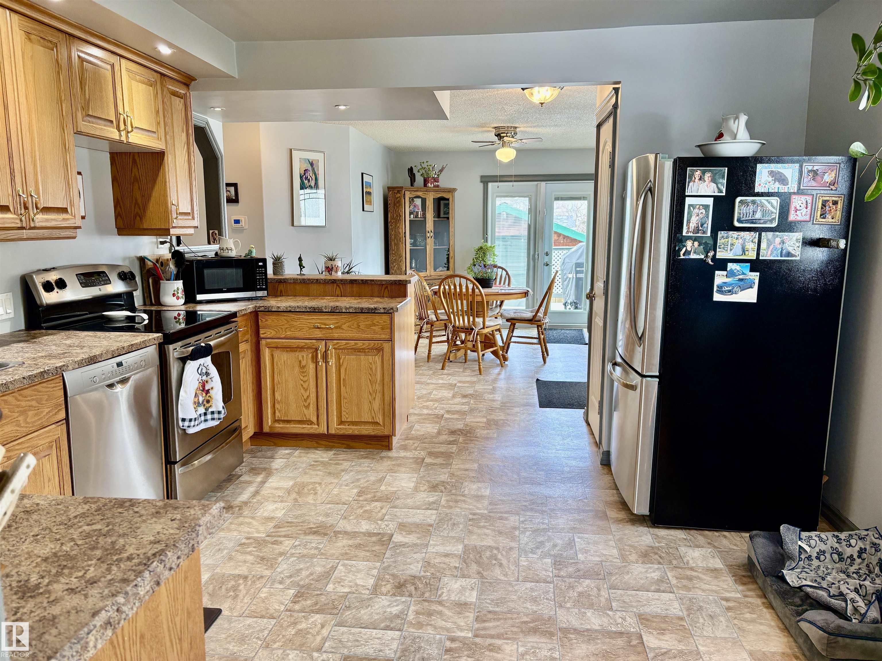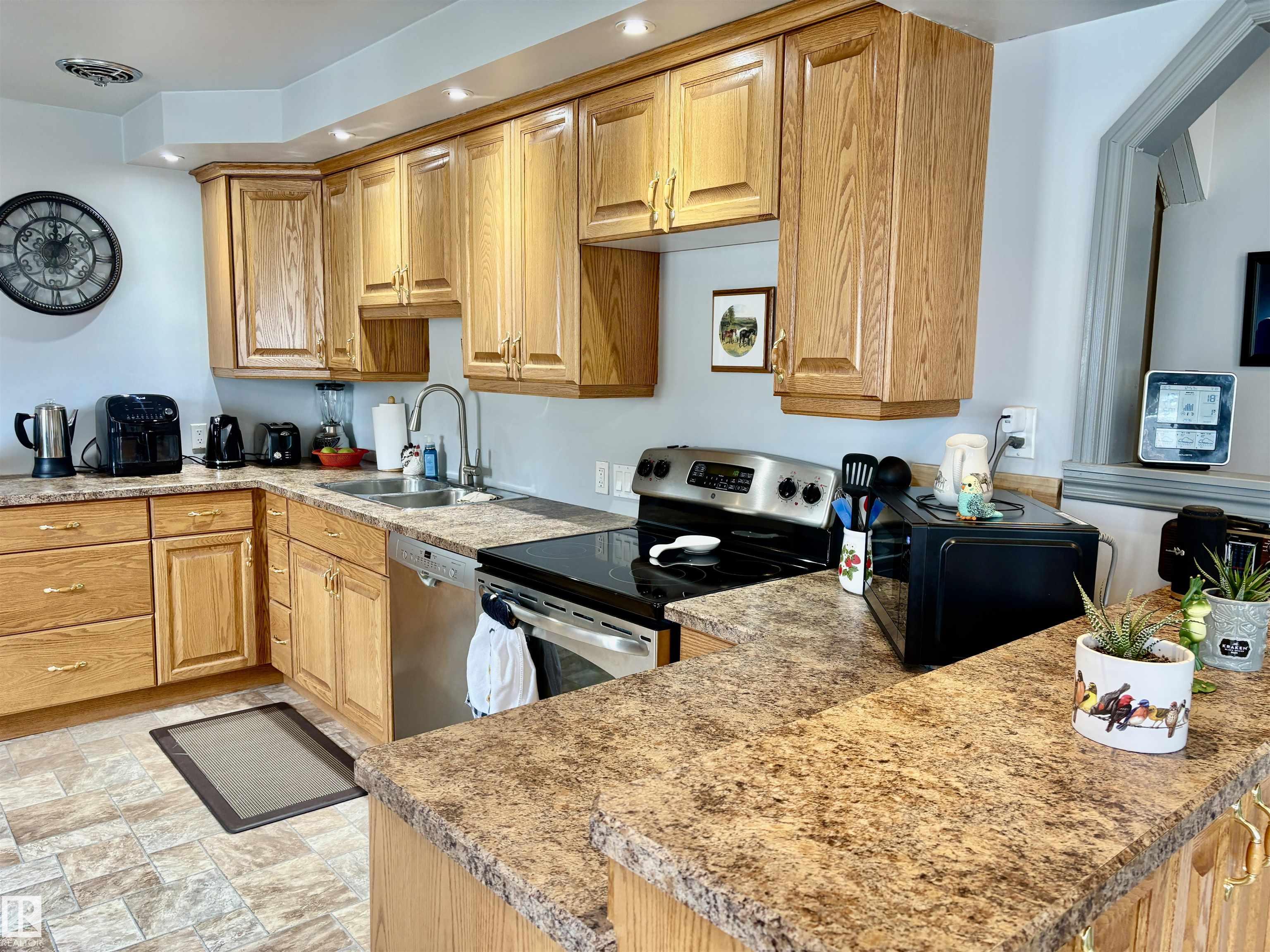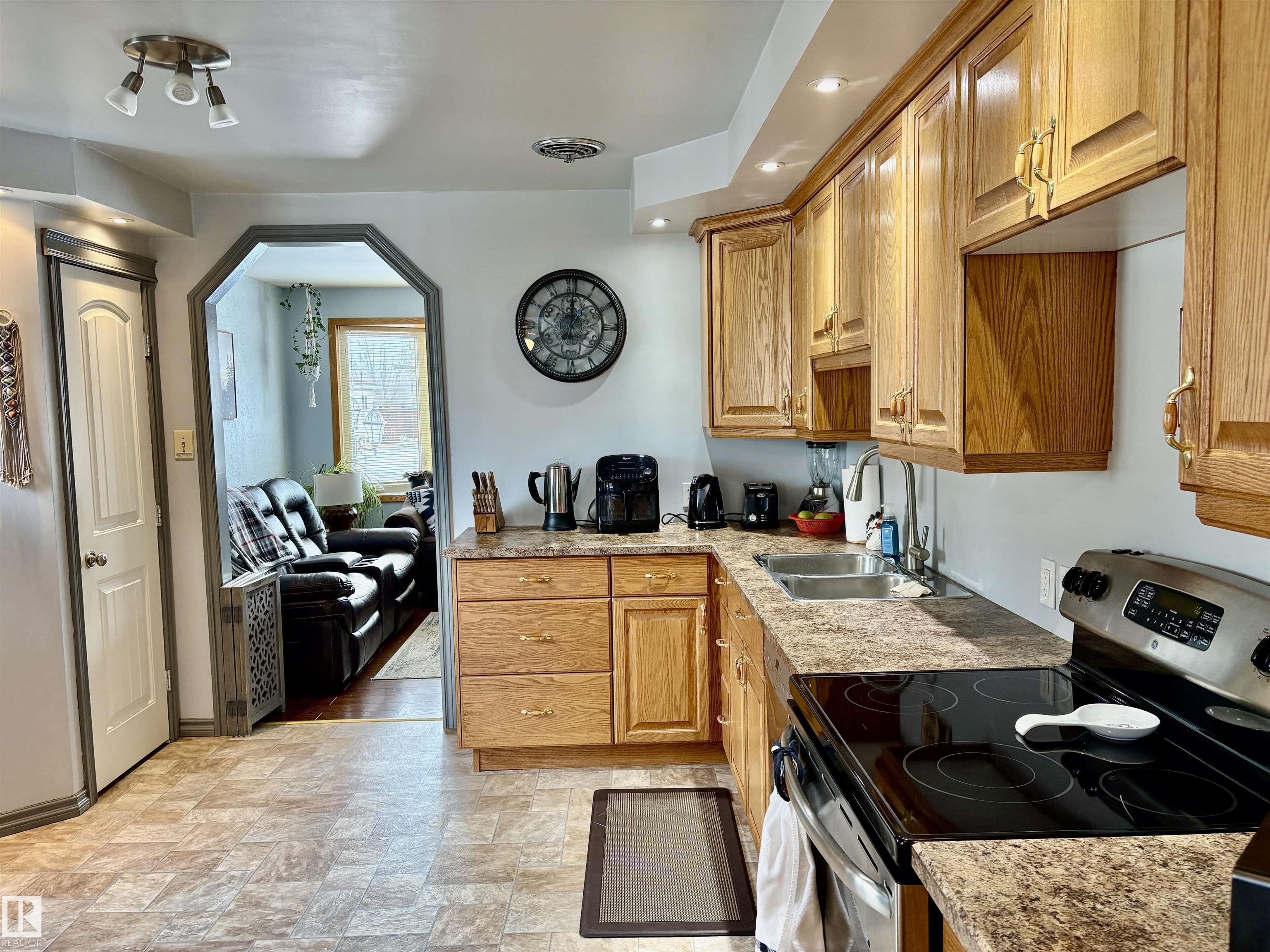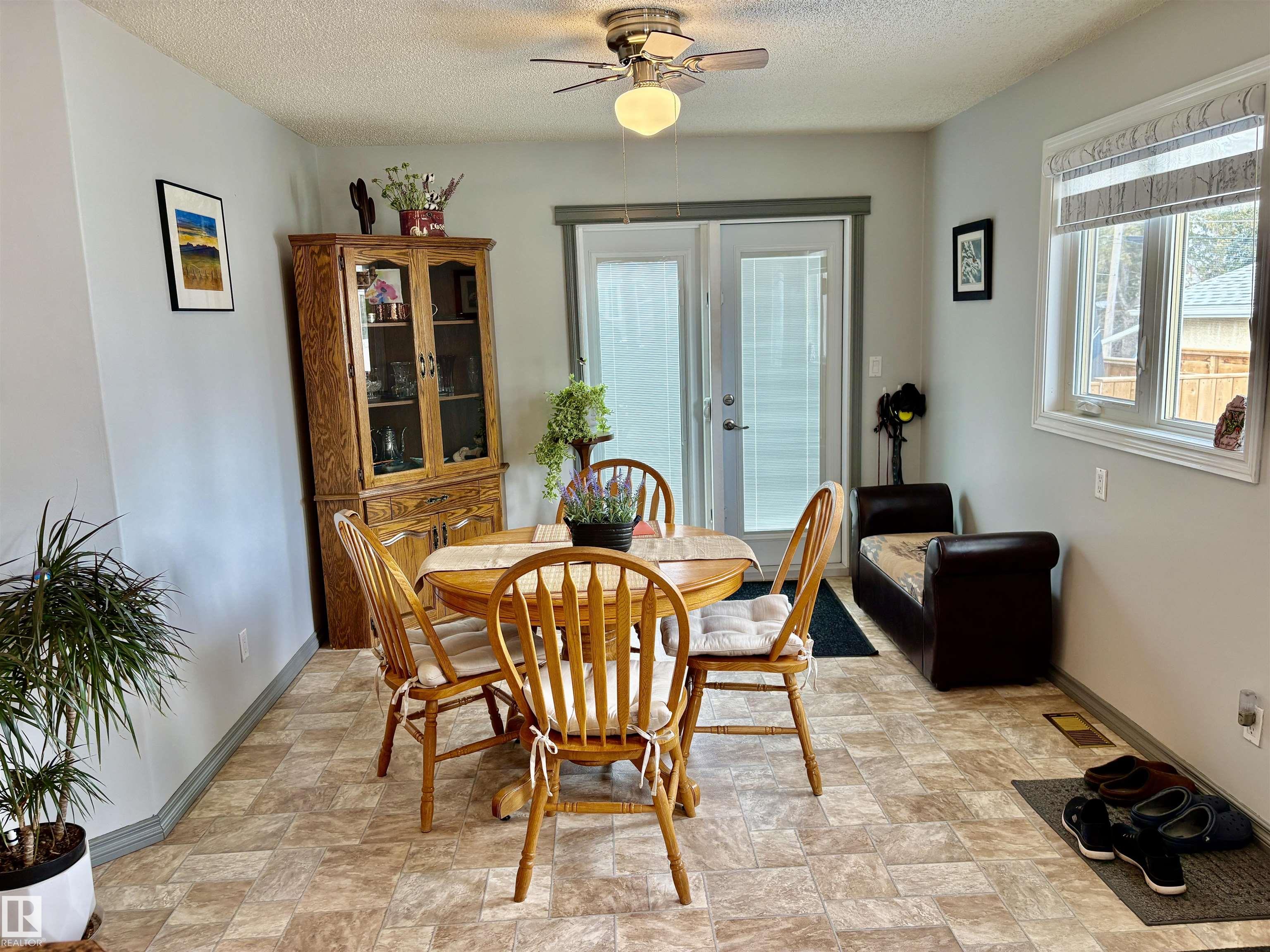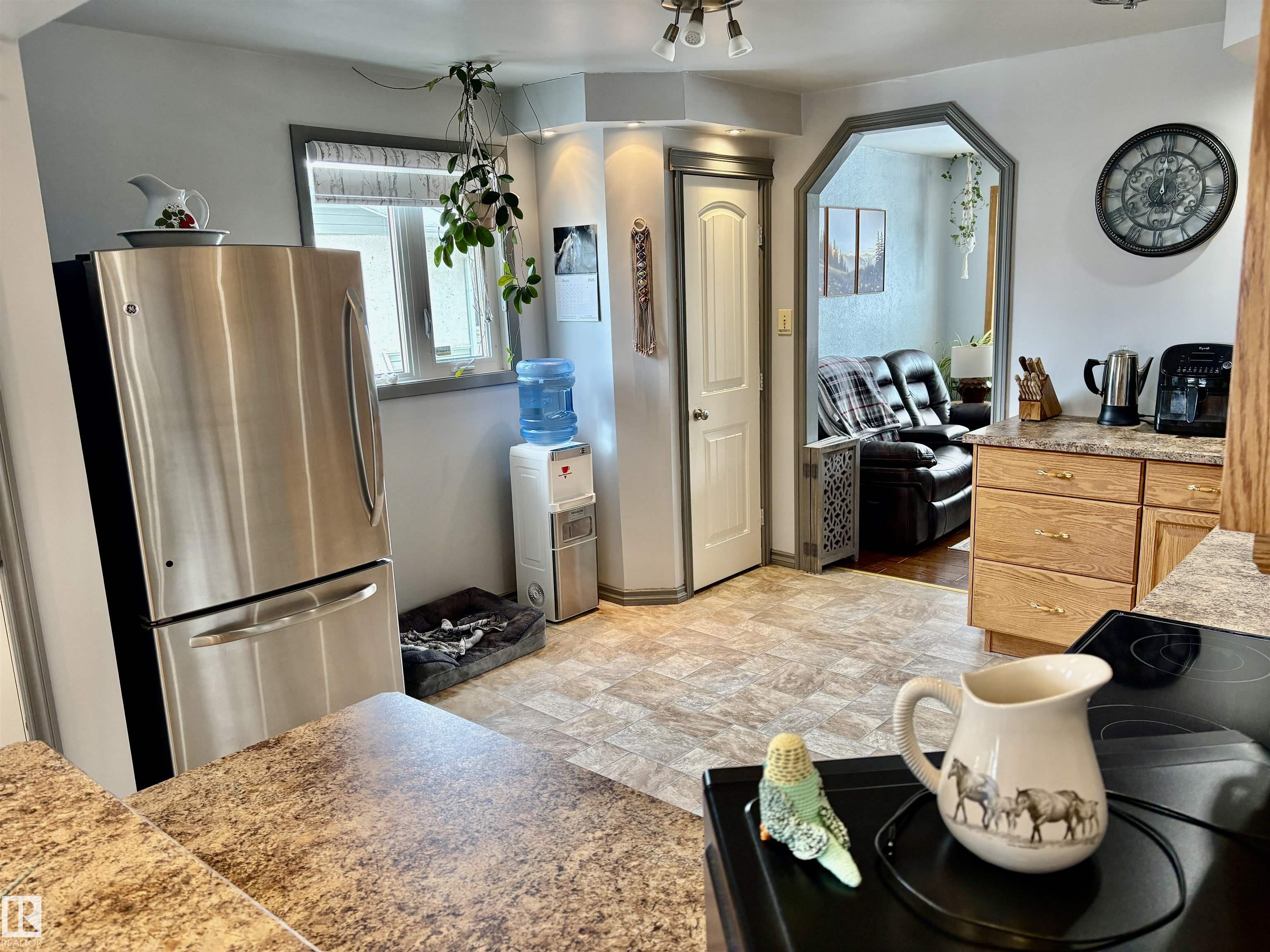 Calling all Seniors or 1st time home buyers... This one is a gem!! Main Floor laundry, 2 bedrooms on main floor with 2 bathrooms with a jetted tub, enormous kitchen with at spacious dining area over looking the deck and gazebo. The living room faces east and is a cozy area for your family. In the basement you will find a rec. room and office area and plenty of storage. Some of the upgrades include: new hot water on demand, newer windows, A/C, new fence, newer furnace, shingles (2025)eaves & soffits. Nothing to do but move in. There is a heated shed just off the back alley, and enough space for a huge motor home or build a garage if you need. Plenty of parking space right beside the home as well. MLS®: E4478470 - Vegreville Bungalow $295,000